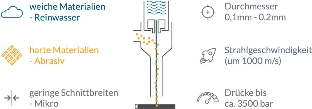 Für den Aufbau des Drucks beim Wasserstrahlschneiden sind Hochdruckpumpen verantwortlich. Theoretisch möglich sind Drücke bis ca. 6500 bar, in der Praxis sind jedoch um die 3500 bar gebräuchlich. Anschließend wird der Wasserstrahl durch eine feine Düse geschickt. Aus dem Schneidkopf tritt der Wasserstrahl dann mit Überschallgeschwindigkeit (um 1000 m/s) aus und ist aufgrund seiner starken Beschleunigung und Bündelung (haarfein, ca 0,1 mm im Durchmesser) nun in der Lage, vielfältige Materialien zu schneiden.
